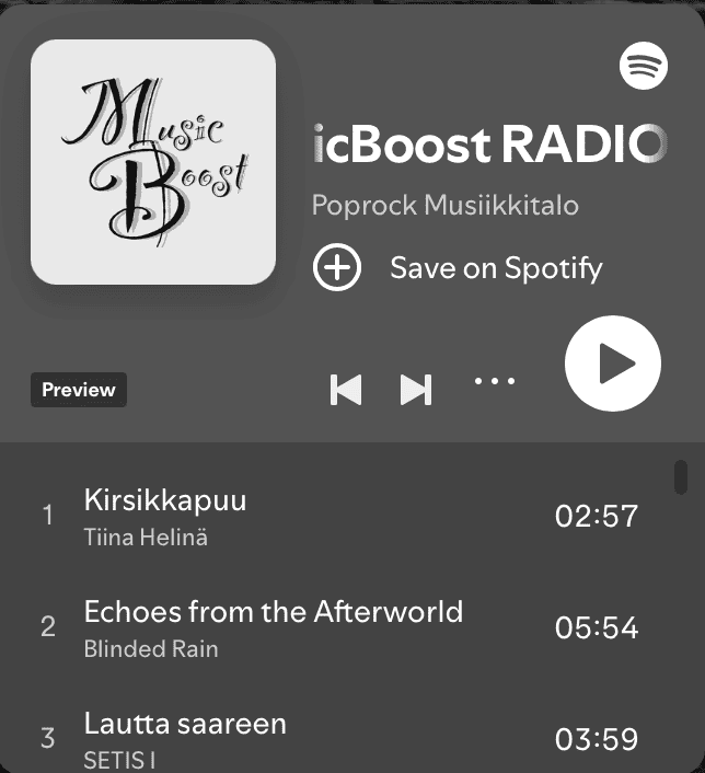 MusicBoost RADIO-soittolista sisältää asiakkaidemme; artistien ja bändien julkaisuja. Monilla on useita julkaisuja, mutta listassa on vain yksi biisi kutakin kohden.